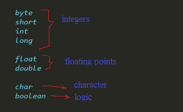 දැන් ටිකක් හරි මතක තියාගන්න ලේසියි නේද? integers තියාගන්න පුළුවන් data type 4යි, floating point තියාගන්න data type 1යි, character වලට data type 1යි, logic වලට data type 1යි එකතු වෙලා තමයි java වල data type 8ක් ඇවිල්ලා තියෙන්නෙ..