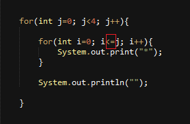 දැන් පේනවා නේද ඇතුලෙ for loop එකේ size එක විදියට අපි දැන් දීලා තියෙන්නෙ row එකේ ඒ run වෙන වෙලාවට තියෙන row value එක.. හැබැයි මෙතනදි පොඩි ප්රශ්නයක් තියෙනවා.. පළවෙනි පාර code එක run වෙනකොට j ගෙ අගය 0 යි නේ? හැබැයි ඇතුලෙ for loop එකේ condition එකේදි i කුඩායි 0 කියන එක i ත් 0 නිසා false වෙනවා.. ඒක නිසා පළවෙනි අවස්ථාව මගහැරිලා තරු පේළි 3යි වදින්නෙ.. ( පළවෙනි එක නිකම්ම false වෙලා තරු print වෙන්නෙ නැති නිසා.. )