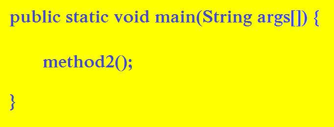 ඒ කියන්නෙ අපි අපේ main එකට පිටින් මෙහෙම ලියන code set එක ලියන්නෙ method එකක් ඇතුලේ.. ඇත්තම කිව්වොතින් main කියලා කියන්නෙත් method එකක්මයි. එහෙනම් අපි coding ලියන්නෙ මොකක් හරි method එකක් ඇතුලේ.. automatically run වෙන method එකට විශේෂ නමක් කියනවා main method එක කියලා. එහෙම නැතුව අපි පස්සෙ අවශ්‍ය code දාලා හදන method වලට main method එකේ ඉඳන් අවශ්‍ය වෙලාවට call කරන්න ඕන..