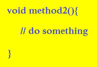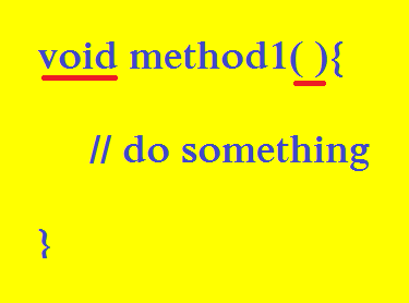 උඩ රූපේ පෙන්නලා තියෙන විදියට තමයි method එකක් හදන්නෙ.. මෙතනදි අපිට දෙන්න ඕන නමට කලින් void කියලා දීලා තියෙනවා method එකක් කියලා පෙන්නන්න ඕන නිසා method එකේ නමට පස්සෙ වරහනක් දාලා තියෙනවා. ඊට පස්සෙ ඒ method එක යටතේ ලියන්න ඕන code ටික {} ඇතුලේ ලියන්න තියෙන්නෙ..