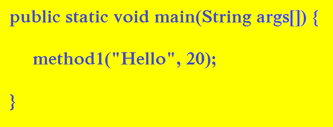 මේකෙදි return කරන්නෙ නැති නිසා අපි return type එක විදියට දීලා තියෙන්නෙ void කියලා.. accept කරන නිසා වරහන ඇතුලෙ parameters හදලා තියෙනවා.. මෙතනදි නම් String value එකක් ගන්න a කියලා variable එකකුයි, integer value එකක් ගන්න b කියලා variable එකකුයි තමයි හදලා තියෙන්නෙ.. දැන් අපි බලමු කොහොමද මේ method එකට call කරන්නෙ කියලා..