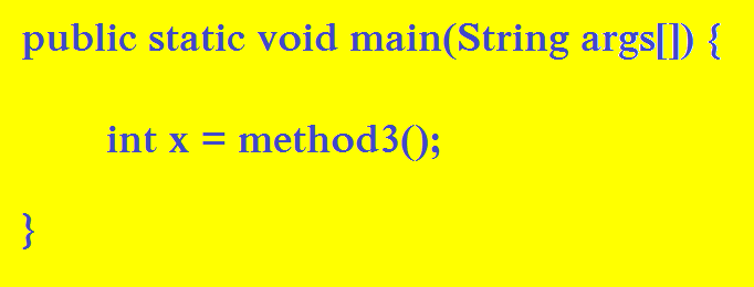 method3() එකට call කරාට පස්සෙ එයා call කරපු තැනට integer value එකක් එවනවානේ.. ඉතින් අපි මෙහෙම එවන value එක අල්ල ගන්න ඕන නිසා තමයි x කියලා integer variable එකක් හදලා method එක call කරාම එන value එක ඒකට දාන්න කියලා තියෙන්නෙ.. අපිට එහෙම එන value එක use කරන්න ඕන නැත්නම් මෙහෙම int x කියලා variable එකක් හදලා ඒකට දාන්න කියලා නොලිව්වට වැරුද්දක් නෑ. ඒත් method3() එකේ code ටික run වෙනවා. මෙහෙම variable එකක් දෙන එකෙන් වෙන එකම දේ තමයි අපිට එහෙම එන value එක use කරන්න පුළුවන් වෙන එක..