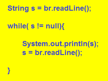 කලින් write කරද්දි කිව්වා වගේම අපි මේ use කරන Bufferd Reader ක්රමේ විතරක්ම නෙවෙයි File එකක් read කරන්න තියෙන්නෙ.. අපිට වැඩේ කරගන්න පුළුවන් එක ක්රමයක් විතරක් තිබුනම ඇති නිසා තමයි මේ ක්රමේ විතරක් කරන්නෙත්.. අනික මේ ක්රමේ ගොඩක් ලේසියි මතක තියාගන්න..